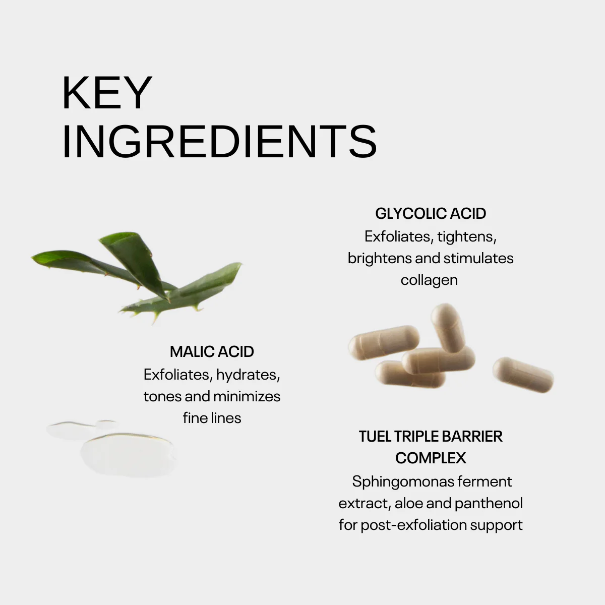 • Malic acid exfoliates, hydrates, tone and minimizes fine lines